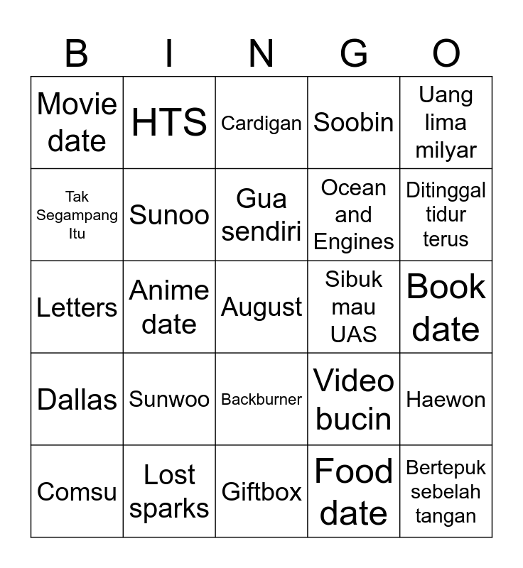 This bingo card has a free space and 24 words: Comsu, Sunwoo, Gua sendiri, Food date, Uang lima milyar, Movie date, HTS, Cardigan, Sibuk mau UAS, Book date, Letters, Sunoo, Video bucin, Haewon, Tak Segampang Itu, Lost sparks, Giftbox, Soobin, Ditinggal tidur terus, Dallas, Anime date, Backburner, Ocean and Engines and Bertepuk sebelah tangan.