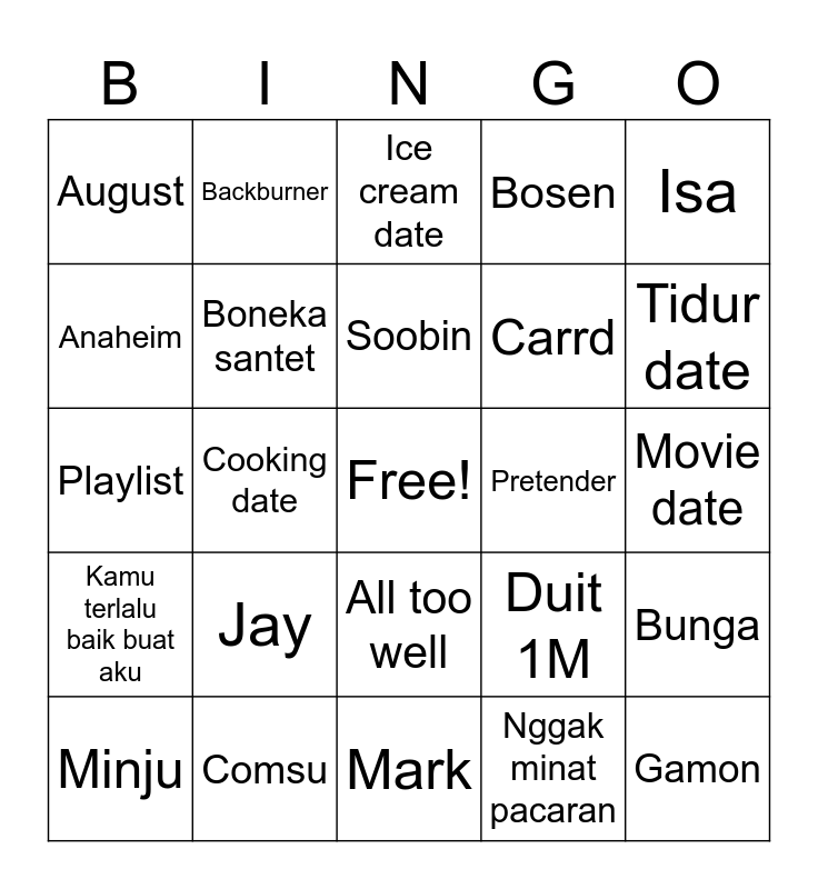 This bingo card has a free space and 25 words: Jay, Mark, Soobin, Minju, Isa, August, Anaheim, Backburner, Pretender, All too well, Carrd, Playlist, Duit 1M, Bunga, Boneka santet, Indomie date, Movie date, Ice cream date, Tidur date, Cooking date, Gamon, Comsu, Kamu terlalu baik buat aku, Bosen and Nggak minat pacaran.