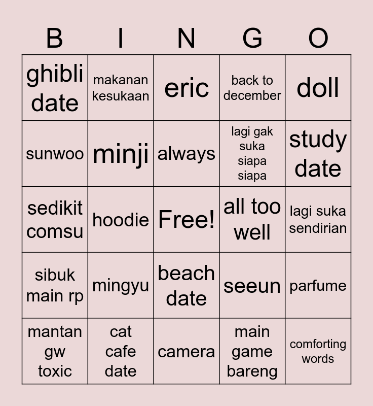 This bingo card has a free space and 24 words: mantan gw toxic, mingyu, always, main game bareng, doll, ghibli date, makanan kesukaan, eric, all too well, lagi suka sendirian, sedikit comsu, minji, seeun, parfume, sunwoo, cat cafe date, camera, back to december, study date, sibuk main rp, hoodie, beach date, lagi gak suka siapa siapa and comforting words.