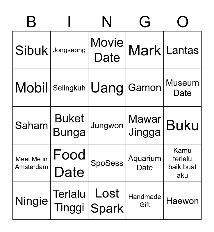 This bingo card has a free space and 24 words: Ningie, Food Date, Uang, Handmade Gift, Lantas, Sibuk, Jongseong, Movie Date, Mawar Jingga, Buku, Saham, Selingkuh, Aquarium Date, Kamu terlalu baik buat aku, Mobil, Terlalu Tinggi, Lost Spark, Mark, Museum Date, Meet Me in Amsterdam, Buket Bunga, SpoSess, Gamon and Haewon.