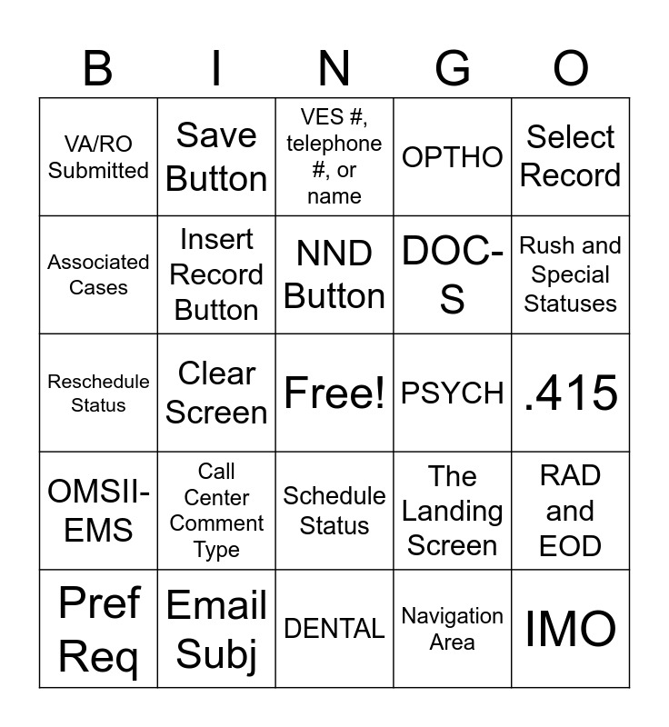 This bingo card has a free space and 34 words: View Button, Navigation Area, Day One Call Status, GEN MED, OMSII-EMS, Insert Record Button, Select Record, Pref Req, Save Button, TBI, NND Button, VES #, telephone #, or name, Universal Comment, Short-Notice Appointment Status, PSYCH, Rush and Special Statuses, Email Subj, Reschedule Status, Call Center Comment Type, The Landing Screen, Schedule Status, Pls Call Button, VA/RO Submitted, .415, DENTAL, IMO, OPTHO, AUDIO, DOC-S, Associated Cases, VA Search, Clear Screen, RAD and EOD and PS.
