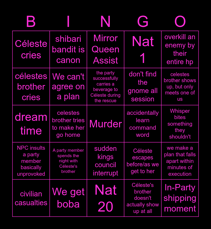 This bingo card has a free space and 24 words: A party member spends the night with Céleste's brother, We get boba, the party successfully carries a beverage to Céleste during the rescue, civilian casualties, overkill an enemy by their entire hp, Céleste cries, célestes brother cries, shibari bandit is canon, accidentally learn command word, sudden kings council interrupt, don't find the gnome all session, dream time, Céleste escapes before/as we get to her, we make a plan that falls apart within minutes of execution, We can't agree on a plan, Céleste's brother doesn't actually show up at all, Whisper bites something they shouldn't, Mirror Queen Assist, celestes brother shows up, but only meets one of us, celestes brother tries to make her go home, In-Party shipping moment, NPC insults a party member basically unprovoked, Nat 1 and Nat 20.