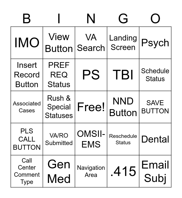 This bingo card has a free space and 34 words: VES #, telephone #< or name, .415, Select Record (Refresh), DOC-S, PLS CALL BUTTON, PREF REQ Status, Psych, Call Center Comment Type, View Button, RAD & EOD, PS, VA Search, Audio, Optho, NND Button, Schedule Status, Gen Med, Associated Cases, VA/RO Submitted, Reschedule Status, OMSII-EMS, CLEAR SCREEN BUTTON, IMO, SAVE BUTTON, Navigation Area, Email Subj, Landing Screen, Short Notice Appointment Status, TBI, Insert Record Button, Day One Call Status, Rush & Special Statuses, Dental and Universal Comment Type.