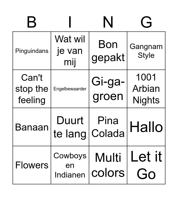 This bingo card has 37 words: Free!, B.E.D.A.N.K.T., Macarena, Gi-ga-groen, I like to move it, 10.000 luchtballonen, 1001 Arbian Nights, Links Rechtsz, Can't stop the feeling, Leef, Hallo, Gangnam Style, Flowers, Multi colors, Engelbewaarder, Let it Go, Ik ga zwemmen, Bon gepakt, Noodgeval, Cowboys en Indianen, Pinguindans, Duurt te lang, Living in the moment, Ganzenpas, Als het avond is, La da da da, Wat wil je van mij, Hoofd schouders, Haai alarm, Vluchtstrook, De maya dans, Stiekem, Pina Colada, Daddy Shark, Nu wij niet meer praten, Banaan and Je moeder heet Henk.
