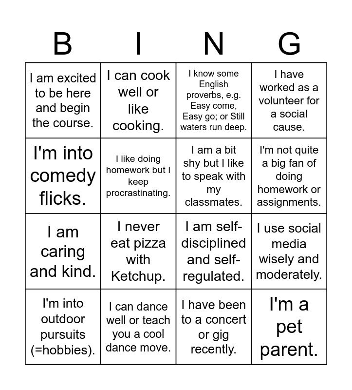 This bingo card has 16 words: I can dance well or teach you a cool dance move., I use social media wisely and moderately., I know some English proverbs, e.g. Easy come, Easy go; or Still waters run deep., I am excited to be here and begin the course., I am caring and kind., I can cook well or like cooking., I am self-disciplined and self-regulated., I have been to a concert or gig recently., I'm into comedy flicks., I like doing homework but I keep procrastinating., I'm into outdoor pursuits (=hobbies)., I have worked as a volunteer for a social cause., I never eat pizza with Ketchup., I'm not quite a big fan of doing homework or assignments., I am a bit shy but I like to speak with my classmates. and I'm a pet parent..