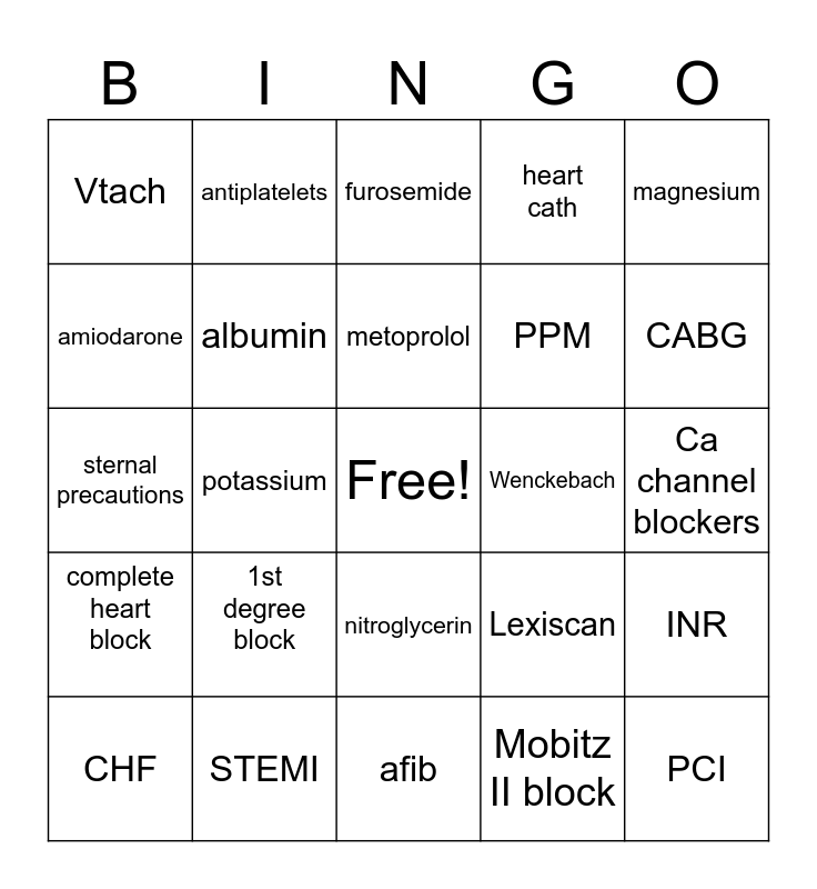 This bingo card has a free space and 24 words: 1st degree block, STEMI, metoprolol, CHF, magnesium, Vtach, amiodarone, antiplatelets, Wenckebach, nitroglycerin, PPM, sternal precautions, Lexiscan, INR, albumin, Mobitz II block, Ca channel blockers, furosemide, CABG, potassium, PCI, complete heart block, heart cath and afib.