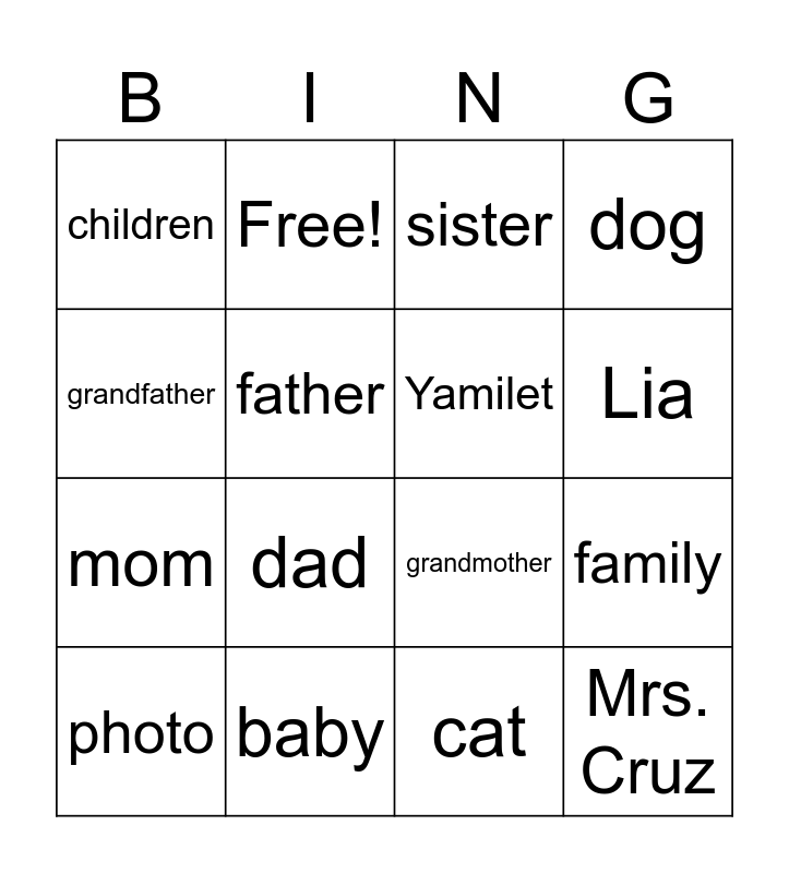 This bingo card has 20 words: family, mother, sister, brother, photo, grandfather, baby, children, mom, Free!, dad, grandmother, father, Mrs. Cruz, Yamilet, Zoe, Lia, dog, cat and house.