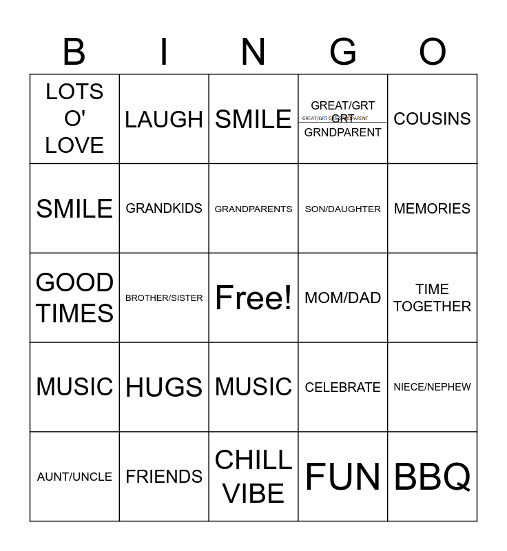 This bingo card has 2 images, a free space and 28 words: FAMILY, FRIENDS, SMILE, LAUGH, COUSINS, LOTS O' LOVE, GRANDKIDS, GRANDPARENTS, MOM/DAD, NIECE/NEPHEW, AUNT/UNCLE, BROTHER/SISTER, FUN, BBQ, GOOD TIMES, MEMORIES, CHILL VIBE, CELEBRATE, MEMORIES, MUSIC, HUGS, SON/DAUGHTER, TIME TOGETHER, SMILE, LAUGH, MUSIC, GREAT/GRT GRT GRNDPARENT and GREAT/GRT GRT GRANDKIDS.