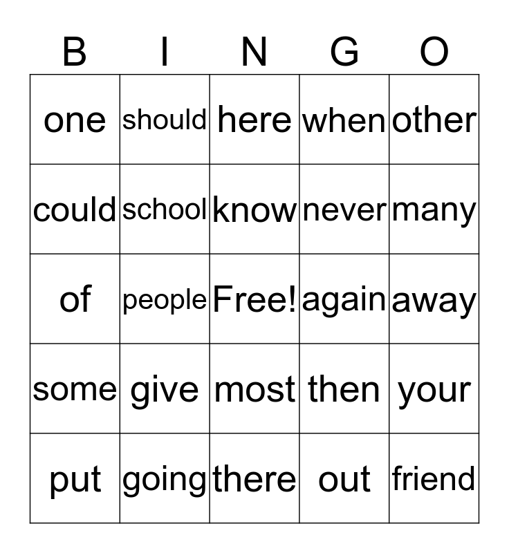 This bingo card has a free space and 24 words: give, going, know, put, other, one, could, should, again, most, never, of, then, your, school, out, away, here, many, people, friend, some, when and there.