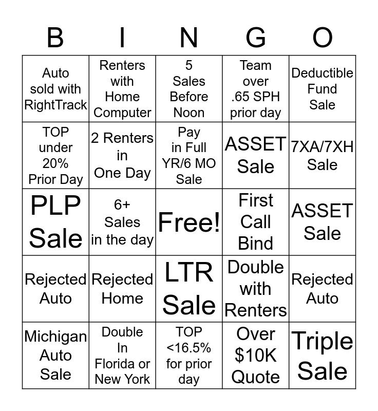 This bingo card has a free space and 24 words: Rejected Home, Double In Florida or New York, Pay in Full YR/6 MO Sale, Michigan Auto Sale, Deductible Fund Sale, Auto sold with RightTrack, TOP under 20% Prior Day, Renters with Home Computer, First Call Bind, LTR Sale, ASSET Sale, PLP Sale, Double with Renters, Rejected Auto, 2 Renters in One Day, Over $10K Quote, ASSET Sale, 5 Sales Before Noon, 7XA/7XH Sale, 6+ Sales in the day, Triple Sale, Rejected Auto, Team over .65 SPH prior day and TOP <16.5% for prior day.