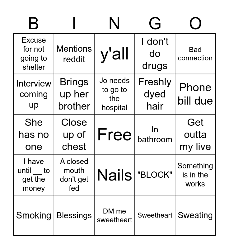 This bingo card has a free space and 24 words: A closed mouth don't get fed, Blessings, Jo needs to go to the hospital, Smoking, Bad connection, Excuse for not going to shelter, Interview coming up, Mentions reddit, In bathroom, Nails, Freshly dyed hair, She has no one, "BLOCK", Something is in the works, Brings up her brother, Sweetheart, Get outta my live, y'all, Phone bill due, Close up of chest, Sweating, I have until __ to get the money, I don't do drugs and DM me sweetheart.