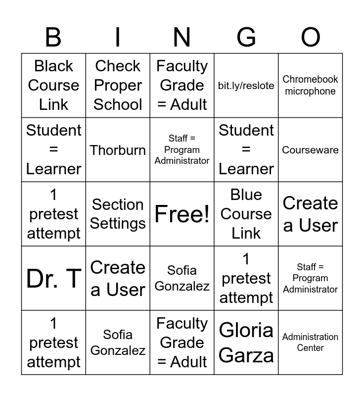 This bingo card has a free space and 148 words: Black Course Link, No exemptions, Account = restx, Blue Circle Complete, Final Course Grade Only, 1 pretest attempt, 3 Blue Dots, Write 5 sentences, Add Selected Students, Chromebook microphone, jthorburn, Faculty Grade = Adult, Administration Center, Section Actions, Sofia Gonzalez, Dr. T, Click check boxes, Start early, bit.ly/reslote, Courseware, Add Students, Staff = Program Administrator, Blue Exempt Star, Texas State ID, Search dbase, Section Settings, Check Proper School, Thorburn, Manage Courses, White Circle Not Started, Blue Course Link, Student = Learner, Janet Barrientos, Create a User, No Google Translate, bit.ly/reslotepres, Gloria Garza, Texas State ID, Student = Learner, No exemptions, Start early, Blue Exempt Star, Sofia Gonzalez, Check Proper School, Janet Barrientos, Administration Center, No Google Translate, Search dbase, White Circle Not Started, Add Students, Thorburn, 3 Blue Dots, 1 pretest attempt, Manage Courses, Create a User, Write 5 sentences, Section Settings, jthorburn, Staff = Program Administrator, Chromebook microphone, Faculty Grade = Adult, Final Course Grade Only, Gloria Garza, Add Selected Students, bit.ly/reslotepres, Blue Course Link, Dr. T, Account = restx, Courseware, Click check boxes, Section Actions, bit.ly/reslote, Black Course Link, Blue Circle Complete, Write 5 sentences, Blue Circle Complete, Click check boxes, Administration Center, Dr. T, bit.ly/reslote, Manage Courses, Section Settings, Chromebook microphone, Start early, bit.ly/reslotepres, Section Actions, Staff = Program Administrator, No Google Translate, Blue Exempt Star, Faculty Grade = Adult, Account = restx, Create a User, Gloria Garza, Blue Course Link, Sofia Gonzalez, 1 pretest attempt, No exemptions, Texas State ID, jthorburn, Final Course Grade Only, Black Course Link, Check Proper School, Student = Learner, Add Students, Janet Barrientos, White Circle Not Started, Add Selected Students, Courseware, 3 Blue Dots, Thorburn, Search dbase, No Google Translate, Section Settings, Thorburn, Create a User, Final Course Grade Only, Courseware, 3 Blue Dots, Administration Center, Chromebook microphone, Check Proper School, 1 pretest attempt, White Circle Not Started, Sofia Gonzalez, Staff = Program Administrator, Section Actions, jthorburn, Dr. T, Manage Courses, Black Course Link, Student = Learner, Write 5 sentences, Add Selected Students, bit.ly/reslotepres, No exemptions, Start early, Faculty Grade = Adult, Add Students, Search dbase, Blue Circle Complete, Account = restx, Click check boxes, Blue Exempt Star, Texas State ID, Janet Barrientos, Blue Course Link, bit.ly/reslote and Gloria Garza.