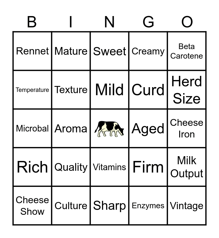 This bingo card has a free space and 24 words: Quality, Culture, Mild, Cheese Show, Beta Carotene, Rennet, Temperature, Mature, Aged, Vitamins, Curd, Microbal, Firm, Milk Output, Texture, Enzymes, Cheese Iron, Sweet, Herd Size, Aroma, Vintage, Rich, Creamy and Sharp.