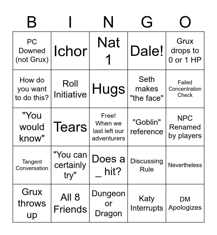This bingo card has a free space and 30 words: All 8 Friends, Critical!, Tears, Technical Issues, PC Downed (not Grux), Nat 1, Roll Initiative, Does a _ hit?, "Goblin" reference, Dungeon or Dragon, NPC Renamed by players, DM Apologizes, Katy Interrupts, Failed Saving throw, Failed Concentration Check, Lore Dump, Discussing Rule, Tangent Conversation, "You can certainly try", Grux drops to 0 or 1 HP, "You would know", Feeling powerful competent, Ichor, Seth makes "the face", How do you want to do this?, Dale!, Nevertheless, Grux throws up, Hugs and Crah-vass.