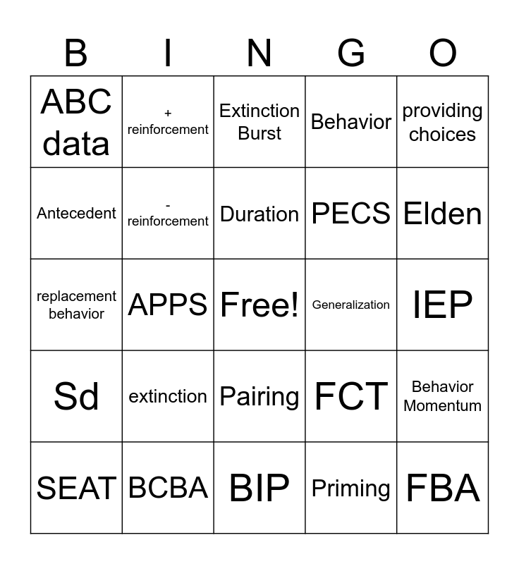 This bingo card has a free space and 34 words: Prompt, Priming, Shaping, Mand, Sd, - reinforcement, providing choices, SEAT, + reinforcement, Tact, Duration, Extinction Burst, Punishment, Frequency, Generalization, Elden, BCBA, replacement behavior, extinction, FCT, Pairing, first, then, ABC data, IEP, BIP, FBA, Behavior, Incidental Teaching, PECS, Antecedent, Consequence, APPS, Behavior Momentum and CPI.