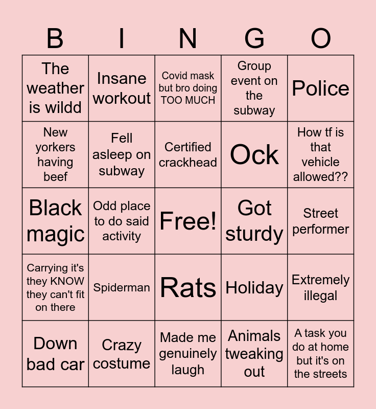 This bingo card has a free space and 24 words: Spiderman, Crazy costume, Certified crackhead, Down bad car, Police, The weather is wildd, New yorkers having beef, Insane workout, Got sturdy, Rats, Ock, Black magic, Holiday, Extremely illegal, Fell asleep on subway, Animals tweaking out, Street performer, Covid mask but bro doing TOO MUCH, How tf is that vehicle allowed??, Odd place to do said activity, A task you do at home but it's on the streets, Carrying it's they KNOW they can't fit on there, Group event on the subway and Made me genuinely laugh.