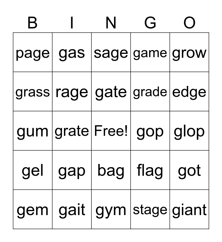 This bingo card has a free space and 29 words: gem, germ, grate, go, page, sage, rage, gap, gop, gait, glop, giant, gym, stage, edge, grass, bag, gel, grow, gum, flag, glue, grade, grass, game, gas, got, gate and goose.