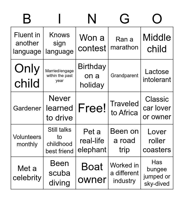 This bingo card has a free space and 33 words: In a band, Saw a play in the last year, Never learned to drive, Pet a real-life elephant, Volunteers monthly, Married/engage within the past year, Middle child, Met a celebrity, Knows sign language, Celebrates an obscure holiday, Birthday on a holiday, Won a contest, Dog Owner, Club leader, Traveled to Africa, Lactose intolerant, Been scuba diving, Gardener, Still talks to childhood best friend, Been on a road trip, Pet a real-life elephant, Knows sign language, Fluent in another language, Classic car lover or owner, Boat owner, Has bungee jumped or sky-dived, Ran a marathon, Grandparent, Only child, Lover roller coasters, Saw a play in the last year, Worked in a different industry and Runs a blog or a social media account.