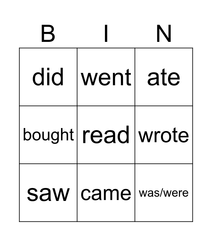 This bingo card has 9 words: saw, ate, went, bought, did, wrote, read, was/were and came.