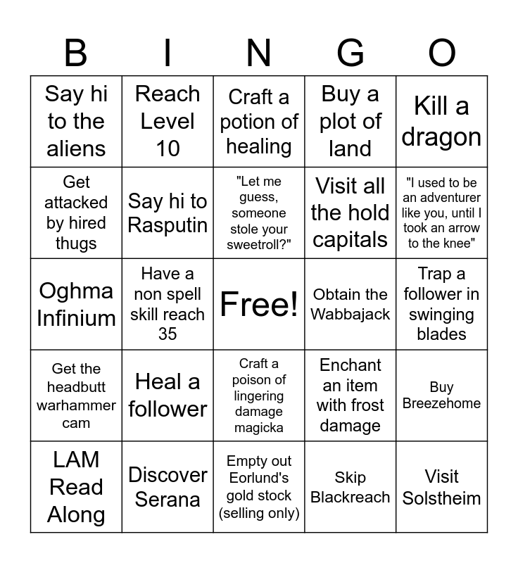 This bingo card has a free space and 50 words: Visit Apocrypha, Visit Solstheim, Loot both Khajiit chests, Empty out Eorlund's gold stock (selling only), Heal a follower, Cast bound bow, Reach Level 10, Complete 3 bounties, Get attacked by hired thugs, Cook Horker Loaf, Say hi to Rasputin, Buy a plot of land, Buy Breezehome, Enchant an item with frost damage, Escape from Jail in 2 major cities, Get a 1000 gold bounty, "Let me guess, someone stole your sweetroll?", Obtain the Wabbajack, Obtain the Eagle Eye perk, Kill a dragon, Have a non spell skill reach 35, Skip Blackreach, Say hi to the aliens, Visit all the hold capitals, Craft Mudcrab Legs, Eat Elsweyr Fondue, "I used to be an adventurer like you, until I took an arrow to the knee", Craft a gold emerald ring, Craft a potion of healing, Craft a poison of lingering damage magicka, Clear out Embershard Mine, Shout at the "true high king", Fus Ro Dah, Wuld off of high Hrothgar, Discover Serana, Complete the correct bounty or 3 potential bounties, Torch some beehives for quest, Narfi for Sithis, Help Cicero with his wagon problem, Trap a follower in swinging blades, Blood and Silver Mine Escape, Pokemon! I choose charmander!, Be a bully for werewolves, Fus Ro Dah Lydia off High Hrothgar, LAM Read Along, Oghma Infinium, Activate the shrines along the steps, Help out Klimmek then permanently retire him, Get the headbutt warhammer cam and Transmute ore into enough gold for 6 rings.