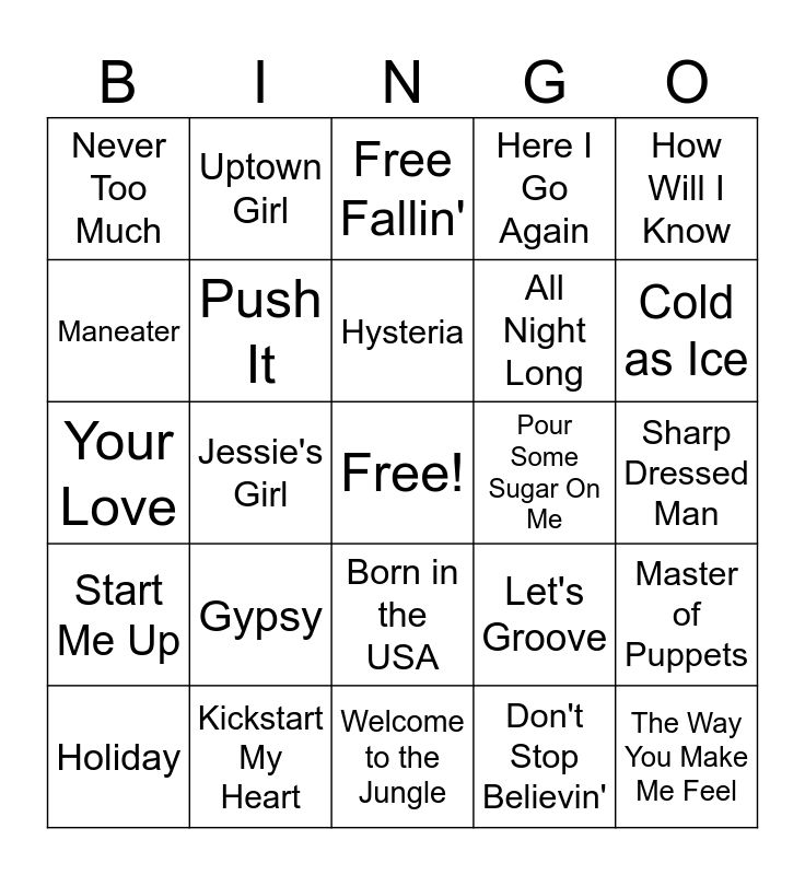 This bingo card has a free space and 29 words: Holiday, Jack & Diane, Jessie's Girl, Fast Car, Never Too Much, Free Fallin', Push It, Gypsy, Pour Some Sugar On Me, Kickstart My Heart, Sharp Dressed Man, The Way You Make Me Feel, Welcome to the Jungle, Don't Stop Believin', Cold as Ice, 9 to 5, Born in the USA, Start Me Up, How Will I Know, Your Love, Let's Groove, Summer of '69, All Night Long, Maneater, Here I Go Again, Uptown Girl, Master of Puppets, Hysteria and What's Love Got to Do With It.