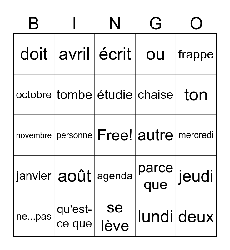 This bingo card has a free space and 55 words: aujourd'hui, ne...pas, travaille, doit, se lève, De rien!, tombe, rit, chaise, sur, ou, vite, lentement, joue, carte, regarde, frappe, personne, choisit, deux, autre, donne, parce que, écrit, test, étudie, lundi, mardi, mercredi, jeudi, vendredi, samedi, dimanche, septembre, octobre, novembre, décembre, janvier, février, mars, avril, mai, juin, juillet, août, qu'est-ce que, mémorise, crayon, mon, ton, nom, devoirs, casier/armoire, agenda and une/un.