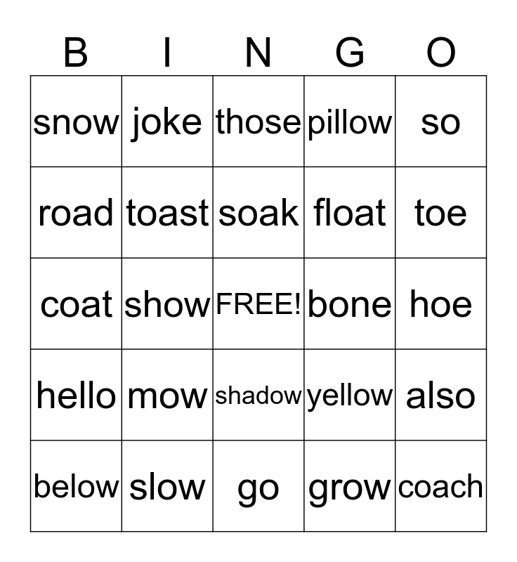 This bingo card has a free space and 24 words: mow, slow, soak, below, so, snow, road, joke, bone, shadow, float, coat, yellow, also, toast, grow, hoe, those, toe, show, coach, hello, pillow and go.