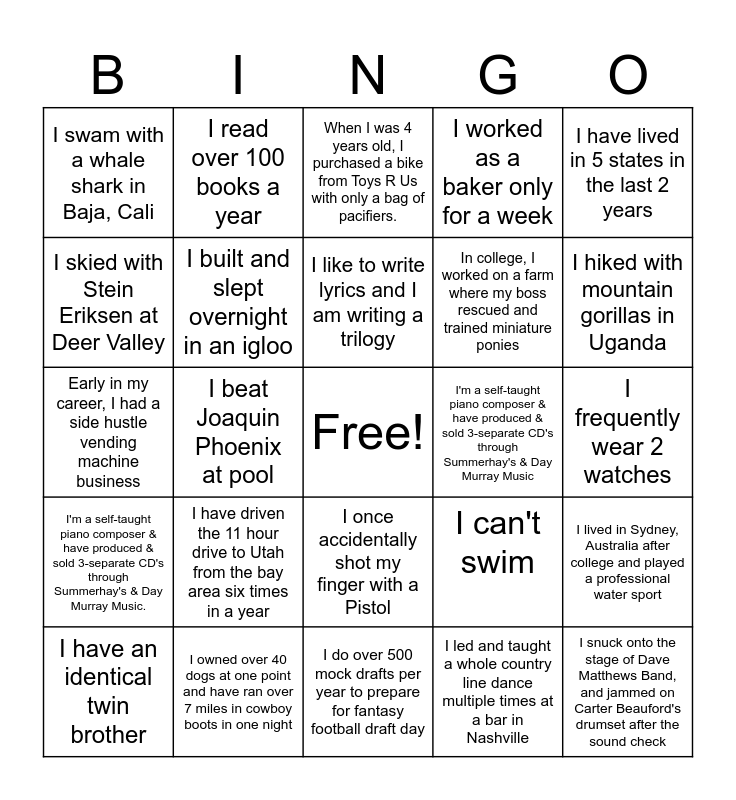This bingo card has a free space and 24 words: I have driven the 11 hour drive to Utah from the bay area six times in a year, I owned over 40 dogs at one point and have ran over 7 miles in cowboy boots in one night, I like to write lyrics and I am writing a trilogy, I have an identical twin brother, I have lived in 5 states in the last 2 years, I swam with a whale shark in Baja, Cali, I skied with Stein Eriksen at Deer Valley, I read over 100 books a year, I'm a self-taught piano composer & have produced & sold 3-separate CD's through Summerhay's & Day Murray Music, I once accidentally shot my finger with a Pistol, In college, I worked on a farm where my boss rescued and trained miniature ponies, Early in my career, I had a side hustle vending machine business, I can't swim, I lived in Sydney, Australia after college and played a professional water sport, I built and slept overnight in an igloo, I led and taught a whole country line dance multiple times at a bar in Nashville, I frequently wear 2 watches, When I was 4 years old, I purchased a bike from Toys R Us with only a bag of pacifiers., I hiked with mountain gorillas in Uganda, I beat Joaquin Phoenix at pool, I snuck onto the stage of Dave Matthews Band, and jammed on Carter Beauford's drumset after the sound check, I'm a self-taught piano composer & have produced & sold 3-separate CD's through Summerhay's & Day Murray Music., I worked as a baker only for a week and I do over 500 mock drafts per year to prepare for fantasy football draft day.