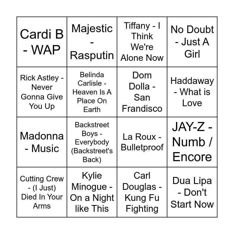 This bingo card has 53 words: Missy Elliott - Lose Control, Cutting Crew - (I Just) Died In Your Arms, Corey Hart - Sunglasses At Night, Kim Wilde - Kids In America, Michael Sembello - Maniac, Anderson .Paak - Am I Wrong, Majestic - Rasputin, Kenny Loggins - Footloose, Belinda Carlisle - Heaven Is A Place On Earth, FISHER - Losing It, Dom Dolla - San Frandisco, Scribe - Not Many, Daft Punk - Get Lucky, Crazy Town - Butterfly, Jennifer Paige - Crush, 3 Doors Down - Kryptonite, Haddaway - What is Love, Kylie Minogue - On a Night like This, Nicki Minaj - Barbie World, Rick Astley - Never Gonna Give You Up, JAY-Z - Numb / Encore, Sophie Ellis-Bextor - Murder On The Dancefloor, Madonna - Music, Cardi B - WAP, Ginuwine - Pony, Savage Garden - To the Moon & Back, Britney Spears - Me Against the Music, Daft Punk - One More Time, Bloodhound Gang - The Bad Touch, Backstreet Boys - Everybody (Backstreet's Back), Will Smith - Gettin' Jiggy Wit It, KC & The Sunshine Band - That's the Way (I Like It), Gloria Gaynor - I Will Survive, DMX - Party Up, Jamelia - Superstar, Divinyls - I Touch Myself, No Doubt - Just A Girl, The Knack - My Sharona, Tiffany - I Think We're Alone Now, Bon Jovi - Livin' On A Prayer, Kool & The Gang - Celebration, Katrina & The Waves - Walking On Sunshine, Carl Douglas - Kung Fu Fighting, Starship - We Built This City, Blue Swede - Hooked On A Feeling, Thin Lizzy - The Boys Are Back In Town, Peaches & Herb - Shake Your Groove Thing, Justice - D.A.N.C.E, La Roux - Bulletproof, Dua Lipa - Don't Start Now, Lily Allen - Not Fair, Eminem - Without Me and Freestylers - Push Up.