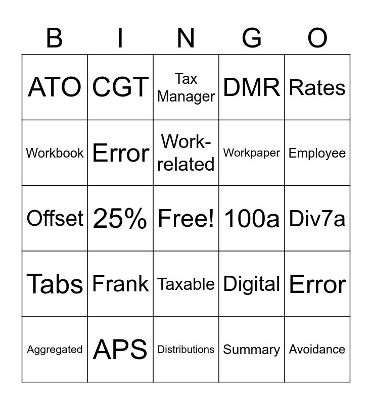 This bingo card has a free space and 40 words: Marginal, Offset, Validation, Error, APS, Taxable, Work-related, Deduction, Rates, Tabs, 25%, DMR, Avoidance, Div7a, 100a, Frank, mygovid, ATO, Tax Agent, Tax Manager, Error, Summary, Workpaper, Workbook, Home, Personal, Super, Internet, Records, Temporary, Financial Year, Aggregated, Turnover, Digital, Employee, Distributions, Dividend, “At Review”, CGT and GST.