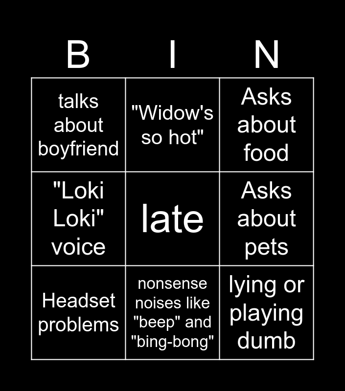 This bingo card has a free space and 8 words: Asks about pets, Asks about food, "Widow's so hot", Headset problems, talks about boyfriend, lying or playing dumb, "Loki Loki" voice and nonsense noises like "beep" and "bing-bong".