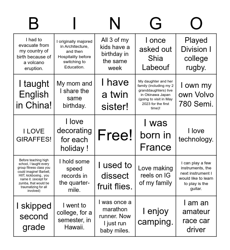 This bingo card has a free space and 57 words: Share a fun fact about you!, I skipped second grade, I'm a Kid at Heart & Really enjoy Culture & Music, I had to evacuate from my country of birth because of a volcano eruption., I was once a marathon runner. Now I just run baby miles., If I wasn't a teacher I would be a forensic accountant, My mom and I share the same birthday., I have hiked to the bottom of the Grand Canyon 2 (soon to be 3) times!, My daughter and her family (including my 2 granddaughters) live in Okinawa Japan (going to visit in May 2023 for the first time)!, My favorite football team is the New Orleans Saints and I make it very known! :D, I once asked out Shia Labeouf, Did not get selected for NJHS because I lacked leadership ability., I have never been to Disneyland., I used to DJ when I was younger. Never well, but it was fun., I am married to my high school sweetheart, I love Kpop and K-dramas and I am learning to speak, read, and write Korean., Played Division I college rugby., I love decorating for each holiday !, I've skydived, I am an amateur race car driver, I was born in France, I am a crazy about movies and I love the VGK and Buffalo Bills, Love making reels on IG of my family, All 3 of my kids have a birthday in the same week, I am an only child and the first in my family to go to college., I have a twin sister!, I have 3 toddlers., I'm the only college graduate in my family, I own my own Volvo 780 Semi., I was a French major but I added Spanish to communicate with my future grandmother-in-law at my wedding., I married an indigenous man from the Amazon Rainforest and that's why my last name is ......, I can lose myself in a book for hours and hours and hours, I'm afraid of heights, yet I have been parasailing., Oldest of 6 siblings but the shortest of them all, I love technology., I taught English in China!, I played guitar for the number one Las Vegas Elvis Tribute show at the Las Vegas Hilton., I LOVE GIRAFFES!, I was in a Miss Teen Oklahoma pageant when I was 15., Before teaching high school, I taught every group fitness class you could imagine! Barbell, HIIT, kickboxing.. you name it. (except for zumba, that would be traumatizing for all involved), I originally majored in Architecture, and then Hospitality before switching to Education., I used to dissect fruit flies., I laugh a lot, I was born in Germany because my mom was in the military in the 70s!, I have traveled to over 35 countries!, I have a painting hang up in the airport, I hold some speed records in the quarter-mile., I went to college, for a semester, in Hawaii., Can’t go to sleep with out put in lotion on my feet., I am really good at remembering things and love talking to people about those random things., I love to dance like Chris brown, I enjoy camping., I buy a lot of stuff and I sell a lot of stuff., When I’m nervous, I laugh stericallyI, I love to watch youtube garden videos and to start a channel, I can play a few instruments, the next instrument I would like to learn to play is the guitar. and Im an amateur boxer.