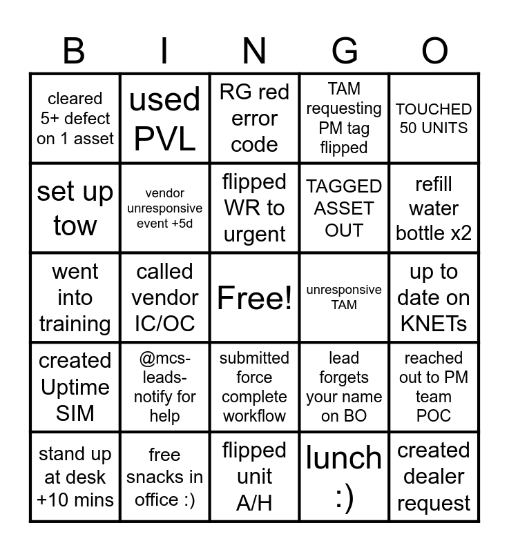 This bingo card has a free space and 49 words: 10 min plus call, created dealer request, set up Canada service, flipped unit A/H, @mcs-leads-notify for help, cleaned up outlook email, used PVL, provided safety tip at SU, set up tow, break :), vendor unresponsive event +5d, TAM requesting PM tag flipped, reached out to PM team POC, lead forgets your name on BO, FILLED OUT 1+ quips, DRANK 1 L WATER, flipped WR to urgent, unresponsive TAM, Stand up time <5 mins, TOUCHED 50 UNITS, called vendor IC/OC, lunch :), cleared 5+ defect on 1 asset, TAGGED ASSET OUT, no missed connects status', refill water bottle x2, stand up at desk +10 mins, helped on +2 paths, submitted force complete workflow, created Uptime SIM, 1on1 with manager, wearing Amazon swag, ordered on Amazon today, sent email to fhq_updates, free snacks in office :), reached out to OM for DD unit, cleared 10+ defects on 1 asset, escalated AFP unit, up to date on KNETs, raised hand at Standup, 20/20/20, engaged with MCS Fun Committee member, filled out MCS F&E survey, connect real time error, went into training, RG red error code, stand up >5mins, computer restart :( and 2nd break :).