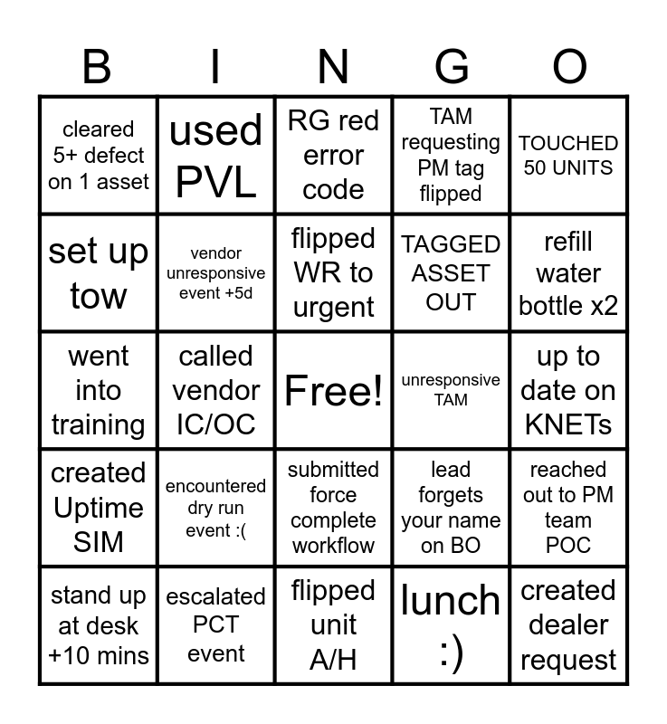 This bingo card has a free space and 49 words: 10 min plus call, created dealer request, set up Canada service, flipped unit A/H, encountered dry run event :(, cleaned up outlook email, used PVL, flipped WR to non-urgent, set up tow, break :), vendor unresponsive event +5d, TAM requesting PM tag flipped, reached out to PM team POC, lead forgets your name on BO, FILLED OUT 1+ quips, DRANK 1 L WATER, flipped WR to urgent, unresponsive TAM, Stand up time <5 mins, TOUCHED 50 UNITS, called vendor IC/OC, lunch :), cleared 5+ defect on 1 asset, TAGGED ASSET OUT, no missed connects status', refill water bottle x2, stand up at desk +10 mins, helped on +2 paths, submitted force complete workflow, created Uptime SIM, 1on1 with manager, wearing Amazon swag, ordered on Amazon today, sent email to fhq_updates, escalated PCT event, reached out to OM for DD unit, cleared 10+ defects on 1 asset, escalated AFP unit, up to date on KNETs, raised hand at Standup, 20/20/20, engaged with MCS Fun Committee member, filled out MCS F&E survey, connect real time error, went into training, RG red error code, stand up >5mins, computer restart :( and 2nd break :).