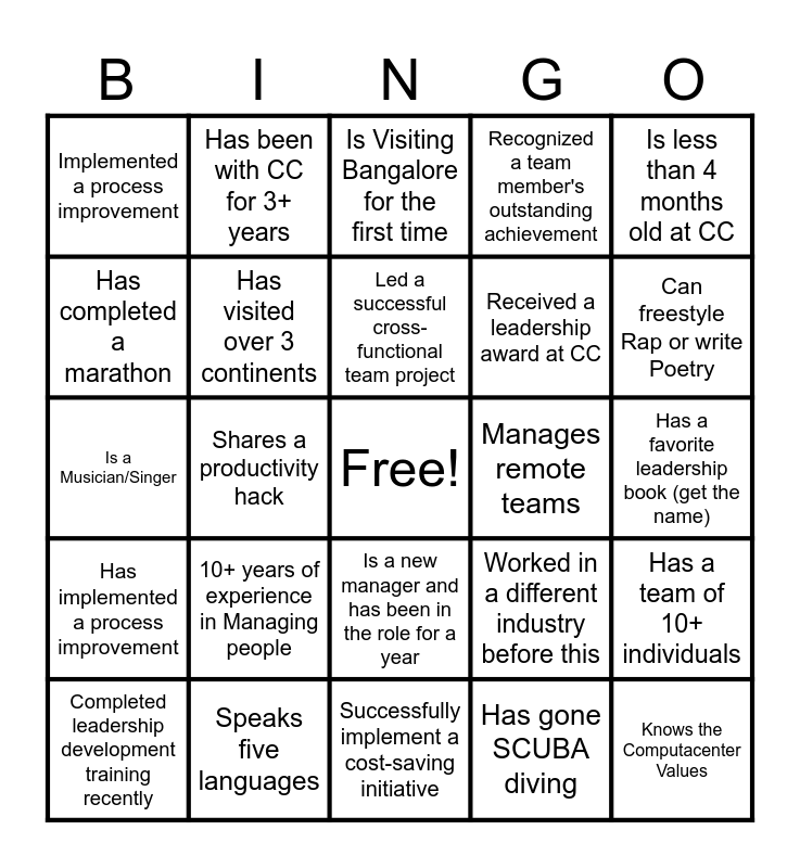 This bingo card has a free space and 24 words: 10+ years of experience in Managing people, Speaks five languages, Led a successful cross-functional team project, Completed leadership development training recently, Is less than 4 months old at CC, Implemented a process improvement, Has completed a marathon, Has been with CC for 3+ years, Manages remote teams, Is a new manager and has been in the role for a year, Received a leadership award at CC, Is a Musician/Singer, Worked in a different industry before this, Has a team of 10+ individuals, Has visited over 3 continents, Has gone SCUBA diving, Has a favorite leadership book (get the name), Is Visiting Bangalore for the first time, Can freestyle Rap or write Poetry, Shares a productivity hack, Knows the Computacenter Values, Has implemented a process improvement, Recognized a team member's outstanding achievement and Successfully implement a cost-saving initiative.