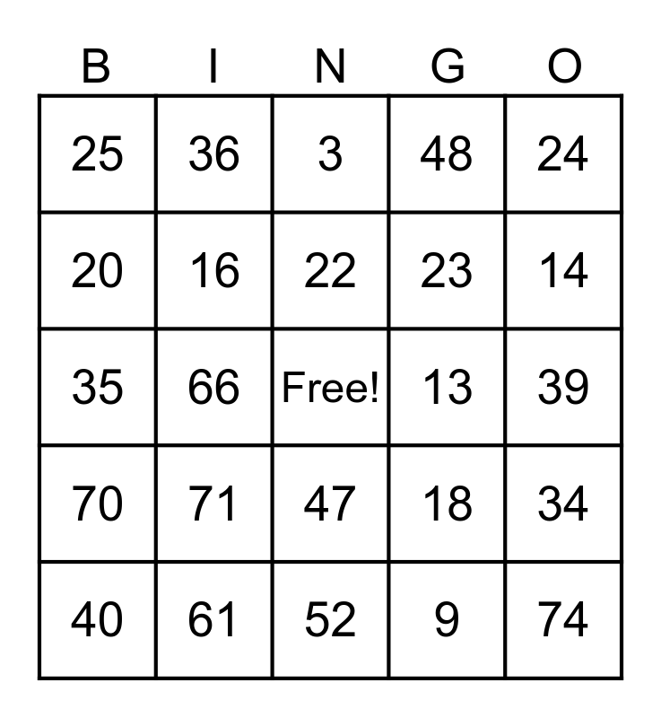 This bingo card has a free space and 75 words: 1, 2, 3, 4, 5, 6, 7, 8, 9, 10, 11, 12, 13, 14, 15, 16, 17, 18, 19, 20, 21, 22, 23, 24, 25, 26, 27, 28, 29, 30, 31, 32, 33, 34, 35, 36, 37, 38, 39, 40, 41, 42, 43, 44, 45, 46, 47, 48, 49, 50, 51, 52, 53, 54, 55, 56, 57, 58, 59, 60, 61, 62, 63, 64, 65, 66, 67, 68, 69, 70, 71, 72, 73, 74 and 75.