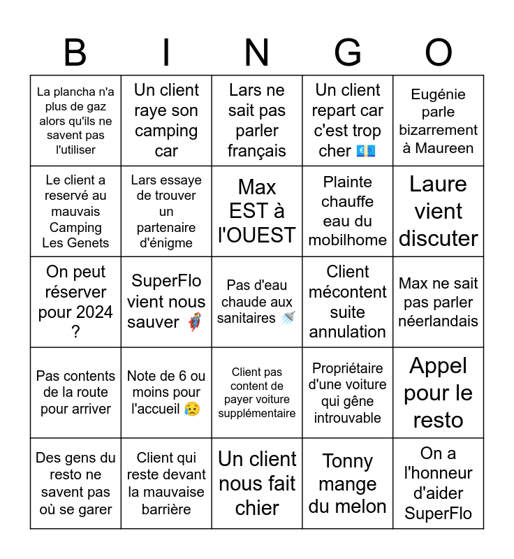 This bingo card has a free space and 24 words: Note de 6 ou moins pour l'accueil 😥, Client qui reste devant la mauvaise barrière, Max EST à l'OUEST, Des gens du resto ne savent pas où se garer, Eugénie parle bizarrement à Maureen, La plancha n'a plus de gaz alors qu'ils ne savent pas l'utiliser, Le client a reservé au mauvais Camping Les Genets, Un client raye son camping car, Client mécontent suite annulation, Client pas content de payer voiture supplémentaire, Plainte chauffe eau du mobilhome, On peut réserver pour 2024 ?, Propriétaire d'une voiture qui gêne introuvable, Appel pour le resto, Lars essaye de trouver un partenaire d'énigme, Tonny mange du melon, Max ne sait pas parler néerlandais, Lars ne sait pas parler français, Laure vient discuter, SuperFlo vient nous sauver 🦸♂️, On a l'honneur d'aider SuperFlo, Pas contents de la route pour arriver, Un client repart car c'est trop cher 💶 and Un client nous fait chier.