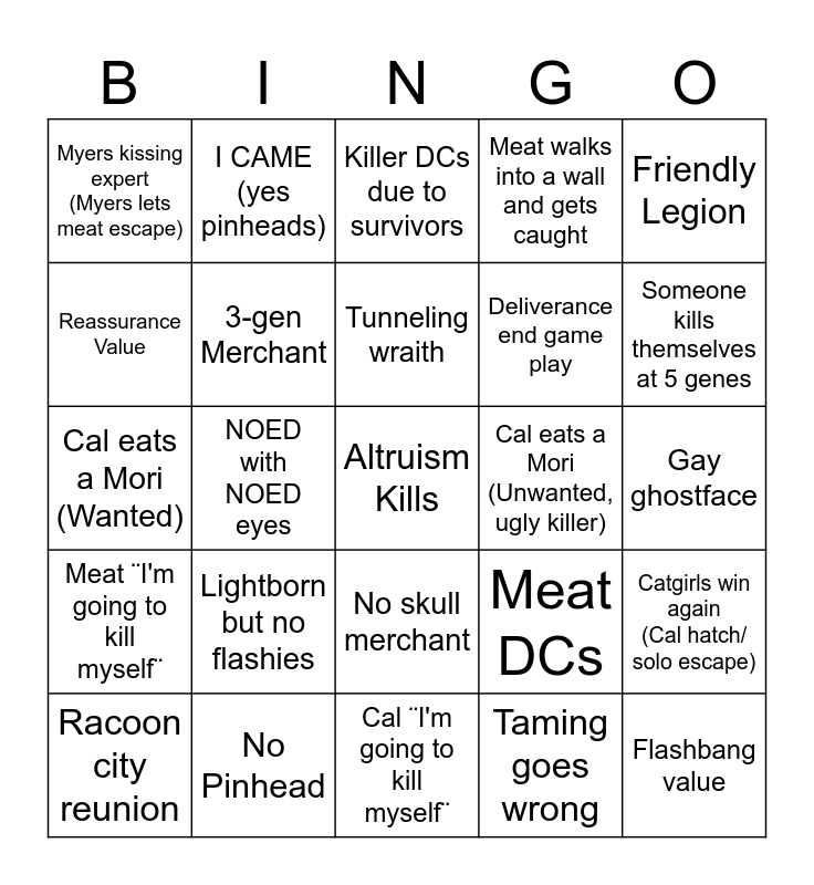 This bingo card has a free space and 24 words: Lightborn but no flashies, No Pinhead, Tunneling wraith, Racoon city reunion, Friendly Legion, Myers kissing expert (Myers lets meat escape), Reassurance Value, I CAME (yes pinheads), Cal eats a Mori (Unwanted, ugly killer), No skull merchant, Deliverance end game play, Cal eats a Mori (Wanted), Meat DCs, Catgirls win again (Cal hatch/ solo escape), 3-gen Merchant, Taming goes wrong, Gay ghostface, Killer DCs due to survivors, Someone kills themselves at 5 genes, NOED with NOED eyes, Flashbang value, Meat ¨I'm going to kill myself¨, Meat walks into a wall and gets caught and Cal ¨I'm going to kill myself¨.