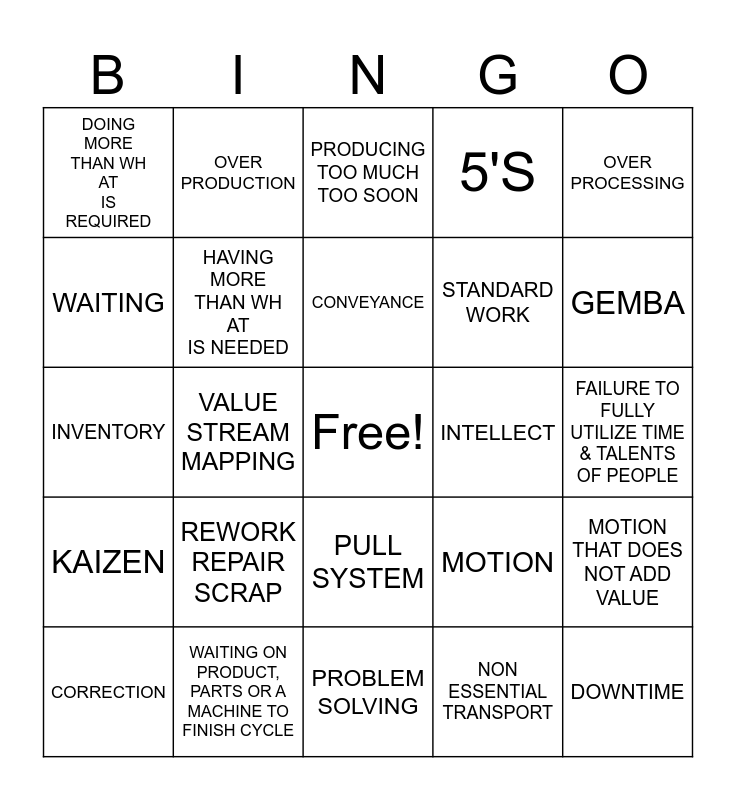 This bingo card has a free space and 24 words: CORRECTION, REWORK REPAIR SCRAP, CONVEYANCE, NON ESSENTIAL TRANSPORT, OVER PROCESSING, DOING MORE THAN WHAT IS REQUIRED, OVER PRODUCTION, PRODUCING TOO MUCH TOO SOON, INTELLECT, FAILURE TO FULLY UTILIZE TIME & TALENTS OF PEOPLE, INVENTORY, HAVING MORE THAN WHAT IS NEEDED, MOTION, MOTION THAT DOES NOT ADD VALUE, WAITING, WAITING ON PRODUCT, PARTS OR A MACHINE TO FINISH CYCLE, PROBLEM SOLVING, 5'S, GEMBA, KAIZEN, VALUE STREAM MAPPING, PULL SYSTEM, STANDARD WORK and DOWNTIME.