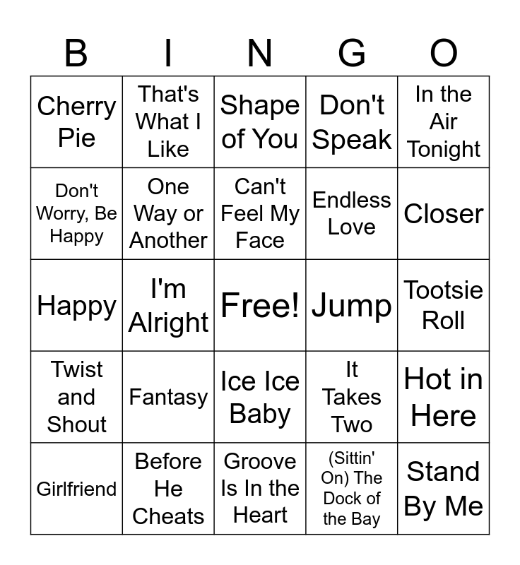 This bingo card has a free space and 95 words: 3:00 AM, (I've Had) The Time of My Life, (Sittin' On) The Dock of the Bay, Always Be My Baby, Angel, Any Way You Want It, Bad Day, Before He Cheats, Blue (Da Ba Dee), Boombastic, Boot Scootin' Boogie, Build Me Up Buttercup, Butterfly, Can't Feel My Face, Chain of Fools, Cherry Pie, Closer, Cotton Eye Joe, Crash Into Me, Crazy, Cry Pretty, Cupid Shuffle, Dancing Queen, Disco Inferno, Don't Speak, Don't Worry, Be Happy, Dreamlover, Endless Love, Faith, Family Tradition, Fantasy, Finesse, Friends in Low Places, Ghetto Superstar, Girlfriend, God's Plan, Groove Is In the Heart, Hakuna Matata, Happy, Hey Mr. D.J., Hot in Here, I'm Alright, Ice Ice Baby, In the Air Tonight, It Takes Two, Jump, Just My Imagination (Running Away With Me), Karma Chameleon, Let it Go, Let's Stay Together, Livin' On a Prayer, Low, Man in the Mirror, Maneater, Material Girl, Miami, Mountain Music, My Guy, My Heart Will Go On, No One, One Way or Another, Panda, Promiscuous, Redbone, Roar, Runaround Sue, Say My Name, Shake it Off, Shape of You, Shout, Sir Duke, Sorry, Stand By Me, Summer Girls, Summer of '69, Summertime, Sweet Caroline, Sweet Home Alabama, Take Me Home, Country Roads, That's What I Like, Theme From New York, New York, Timber, Time After Time, Tom Sawyer, Tootsie Roll, Twist and Shout, Umbrella, Walk Like an Egyptian, Walking in Memphis, We Are the Champions, Whatever You Like, Where Did Our Love Go, Wishing Well, Wobble and Wrecking Ball.