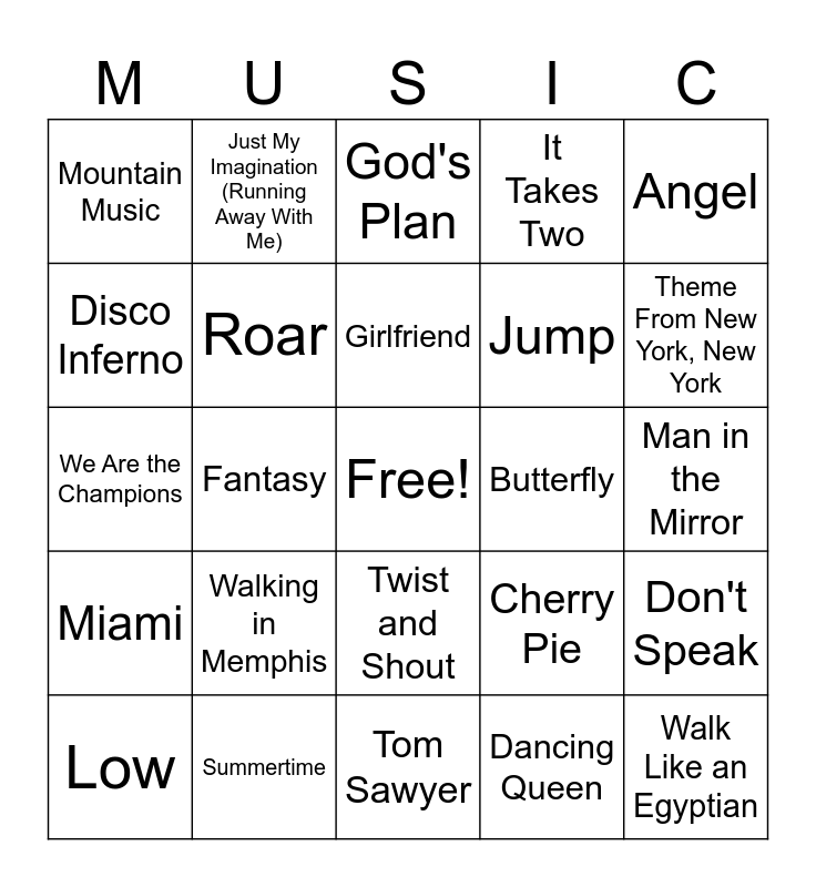 This bingo card has a free space and 95 words: My Heart Will Go On, Finesse, Dancing Queen, Time After Time, Ice Ice Baby, Hot in Here, Faith, Summertime, One Way or Another, Shape of You, Say My Name, Boot Scootin' Boogie, No One, Girlfriend, Sweet Caroline, Mountain Music, Theme From New York, New York, Hey Mr. D.J., Closer, Shout, Where Did Our Love Go, Sir Duke, Chain of Fools, Runaround Sue, It Takes Two, Disco Inferno, Groove Is In the Heart, Jump, Always Be My Baby, I'm Alright, Walking in Memphis, Cotton Eye Joe, In the Air Tonight, Cry Pretty, Low, Stand By Me, Tom Sawyer, Boombastic, We Are the Champions, Shake it Off, Don't Speak, Fantasy, Twist and Shout, Angel, Cherry Pie, Butterfly, Cupid Shuffle, Panda, Wrecking Ball, Blue (Da Ba Dee), Crazy, Happy, Family Tradition, (Sittin' On) The Dock of the Bay, Take Me Home, Country Roads, Bad Day, Endless Love, Summer Girls, Hakuna Matata, Let it Go, Roar, 3:00 AM, Redbone, Don't Worry, Be Happy, (I've Had) The Time of My Life, That's What I Like, Sorry, Timber, God's Plan, Whatever You Like, Dreamlover, Karma Chameleon, Walk Like an Egyptian, Livin' On a Prayer, Ghetto Superstar, My Guy, Sweet Home Alabama, Crash Into Me, Wobble, Just My Imagination (Running Away With Me), Maneater, Tootsie Roll, Promiscuous, Can't Feel My Face, Man in the Mirror, Miami, Any Way You Want It, Let's Stay Together, Friends in Low Places, Summer of '69, Before He Cheats, Umbrella, Wishing Well, Material Girl and Build Me Up Buttercup.
