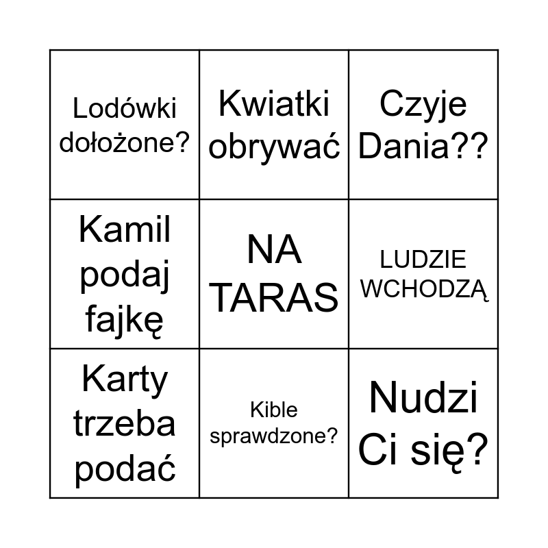This bingo card has a free space and 8 words: LUDZIE WCHODZĄ, Czyje Dania??, Kwiatki obrywać, Karty trzeba podać, Lodówki dołożone?, Nudzi Ci się?, Kamil podaj fajkę and Kible sprawdzone?.