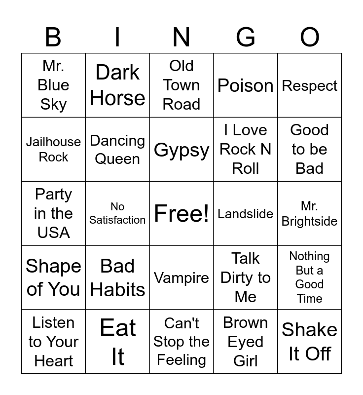 This bingo card has a free space and 50 words: Sunflower, Shake It Off, Africa, Can't Stop the Feeling, Bad Habits, Sober Up, Dark Horse, Roar, Jailhouse Rock, Don't be Cruel, Dancing Queen, Poison, Nothing But a Good Time, Talk Dirty to Me, Hips Don't Lie, California Girls, Gypsy, Landslide, Bad Romance, Respect, No Satisfaction, Brown Eyed Girl, Mr. Blue Sky, I Love Rock N Roll, I Gotta Feeling, Happy, Good to be Bad, Let it Go, Old Town Road, Vampire, Barbie Girl, When the Sun Goes Down, Chicken Fried, Toes, Eat It, Happier, Poker Face, Spiderwebs, Under Pressure, Mr. Brightside, Laid, The Anthem, Blinding Lights, Take on Me, Listen to Your Heart, Party in the USA, You're Welcome, ABCDEFU, Shape of You and The Lazy Song.