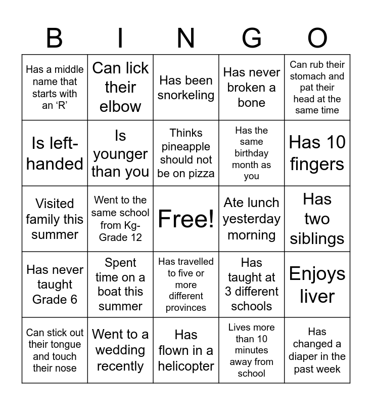 This bingo card has a free space and 33 words: Was born in another province, Would rather go to Timmy’s than Starbucks, Went to the same school from Kg-Grade 12, Can say ‘good-bye’ in four different languages, Has never taught Grade 6, Is younger than you, Can rub their stomach and pat their head at the same time, Can stick out their tongue and touch their nose, Can lick their elbow, Lives on a farm, Thinks pineapple should not be on pizza, Has been snorkeling, Read at least four books over the summer, Knows the name of a 12-sided shape, Ate lunch yesterday morning, Has 10 fingers, Went to a wedding recently, Visited family this summer, Spent time on a boat this summer, Has taught at 3 different schools, Has travelled to five or more different provinces, Went camping over the summer, Has a middle name that starts with an ‘R’, Has two siblings, Has flown in a helicopter, Has changed a diaper in the past week, Has never broken a bone, Has the same birthday month as you, Is left-handed, Enjoys liver, Went on a hike this summer, Lives more than 10 minutes away from school and Has their boating license.