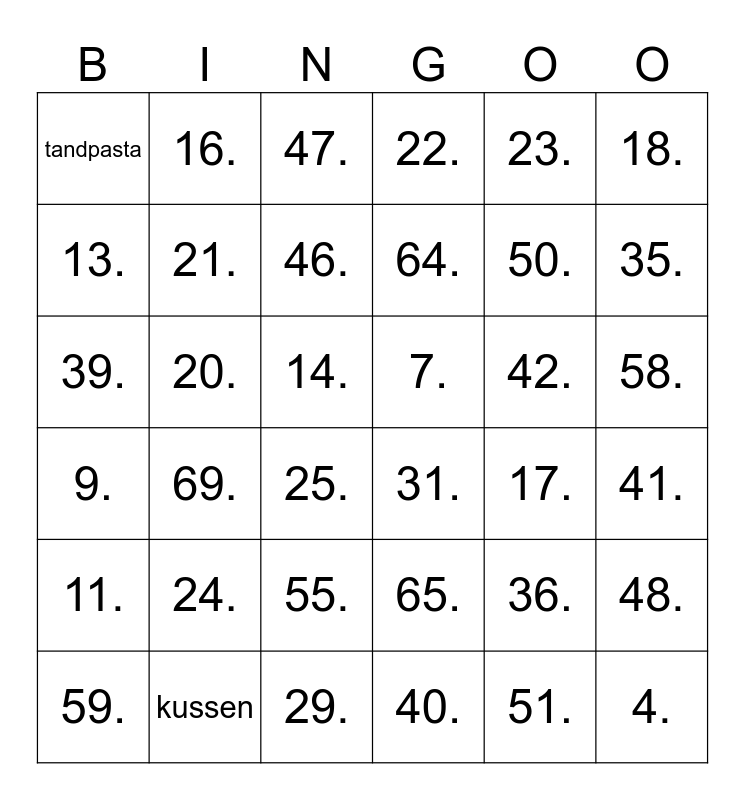 This bingo card has 73 words: Free!, kussen, tandpasta, 4., 5., 6., 7., 8., 9., 10., 11., 12., 13., 14., 15., 16., 17., 18., 19., 20., 21., 22., 23., 24., 25., 26., 27., 28., 29., 30., 31., 32., 33., 34., 35., 36., 37., 38., 39., 40., 41., 42., 43., 44., 45., 46., 47., 48., 49., 50., 51., 52., 53., 54., 55., 56., 57., 58., 59., 60., 61., 62., 63., 64., 65., 66., 67., 68., 69., 70., 71., 72. and 73..