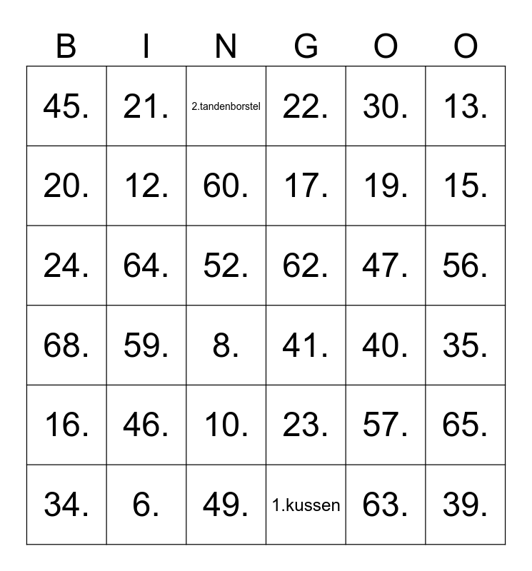 This bingo card has 74 words: Free!, 1.kussen, 2.tandenborstel, 3.tandpasta, 4., 5., 6., 7., 8., 9., 10., 11., 12., 13., 14., 15., 16., 17., 18., 19., 20., 21., 22., 23., 24., 25., 26., 27., 28., 29., 30., 31., 32., 33., 34., 35., 36., 37., 38., 39., 40., 41., 42., 43., 44., 45., 46., 47., 48., 49., 50., 51., 52., 53., 54., 55., 56., 57., 58., 59., 60., 61., 62., 63., 64., 65., 66., 67., 68., 69., 70., 71., 72. and 73..