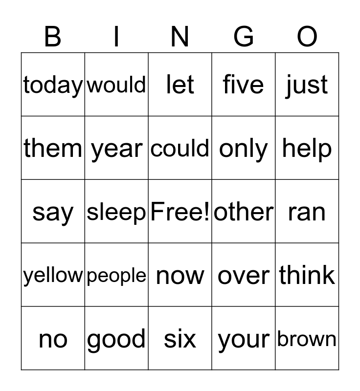 This bingo card has a free space and 24 words: people, good, could, no, just, today, them, would, other, now, only, say, over, think, year, your, ran, let, help, sleep, brown, yellow, five and six.