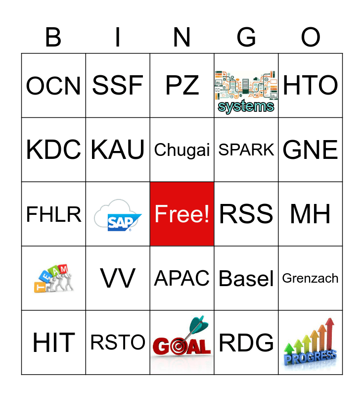 This bingo card has 5 images, a free space and 20 words: VV, RSTO, Chugai, HIT, HTO, OCN, KDC, SSF, RSS, APAC, SPARK, FHLR, Basel, Grenzach, KAU, RDG, MH, PZ, GNE and systems.