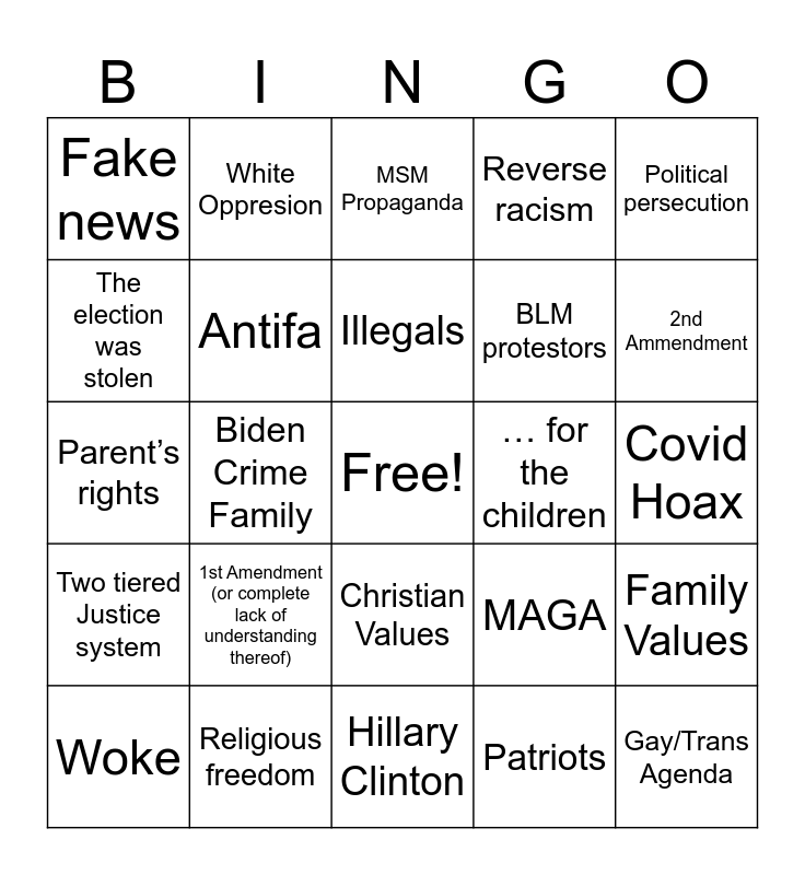 This bingo card has a free space and 29 words: Woke, Deep State, Biden Crime Family, Weaponization of the ______, Fake news, MSM Propaganda, Antifa, 1st Amendment (or complete lack of understanding thereof), … for the children, Religious freedom, Covid Hoax, Gay/Trans Agenda, Hillary Clinton, Patriots, 2nd Ammendment, CCP, Christian Values, Two tiered Justice system, Political persecution, Parent’s rights, MAGA, Hunter Biden, BLM protestors, The election was stolen, Reverse racism, White Oppresion, Family Values, Illegals and Border.