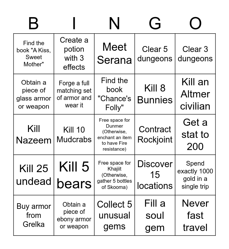 This bingo card has 200 words: Own a horse, Obtain a piece of elven armor or weapon, Join the Thieves' Guild, Join the Dark Brotherhood, Discover all capitals, Get one dragon soul, Escape from jail, Join the Civil war, Acquire 5000 gold, Kill 8 Bunnies, Get a follower, Get a skill to level 40, Own a house, Mine 10 ores, "I've been looking for you", Join the Companions, Learn 5 spells, Win a fist fight, Learn 3 shouts, Pick 20 locks, Learn 20 spells, Kill two Giants, Discover 20 locations, Find a standing stone (Not the Starter 3), Obtain a piece of ebony armor or weapon, Get a skill to level 80, Get a skill to level 50, Kill a Nord civilian, Discover 15 locations, Discover 25 locations, Learn all 3 words of a shout, Buy armor from Grelka, Acquire 7000 gold, Acquire 10000 Gold, Collect 3 different pelts/hides, "I used to be an adventurer", Stack 8 cheese wheels, Give money to 3 different beggers, Get a stat to 150, Collect 10 buckets, Complete 5 miscellaneous quests, Discover 10 different ingredient effects, Enchant a item, Have a full set of enchanted gear (including a ring and necklace), Join the College of Winterhold, Kill an Imperial civilian, Find 5 words from any shout, Level up 10 times, Level up 15 times, Clear 1 dungeon, Clear 3 dungeons, Clear 5 dungeons, Kill Nazeem, Kill 25 undead, Kill 50 animals, Fill a soul gem, Get every skill to level 20, Create 10 different potions, Kill a Blacksmith, Cook 3 different meals, Pickpocket an enchanted item, Steal everything in someone's house and calculate the value, Kill a merchant, Kill a Breton Civilian, Kill a Dunmer civilian, Kill a Redguard civilian, Play on Survival, Collect 1 Claw, Collect 3 claws, Buy skooma from a Khajiit trader, Go to sleep with a doll in inventory after drinking milk, Obtain a piece of dragonscale armor or weapon, Obtain a piece of glass armor or weapon, Obtain a piece of dwarven armor or weapon, Obtain a piece of daedric armor or weapon, Discover a shrine location, Collect 5 unusual gems, Collect a Daedric artifact, Collect 3 Daedric artifacts, Find the book "Songs of Skyrim", Find the book "A Kiss, Sweet Mother", Find the book "Darkest Darkness", Find the book "Catalogue of Armor Enchantments", Find the book "Catalogue of Weapon Enchantments", Find the book "Cats of Skyrim", Find the book "Chance's Folly", Find the book "Fall From Glory", Find the book "Last Scabbard of Akrash", Find the book "Sovngarde, a Reexamination", Find the book "The Book of the Dragonborn", Find the book "The Night Mother's Truth", Find the book "Watcher of Stones", Kill 10 wolves, Kill 10 Elk, Kill 10 Mudcrabs, Become a vampire or a werewolf, Kill 5 bears, Kill 5 Horkers, Catch a bee, Catch two different butterflies, Catch a firefly, Get a kill with a fire, ice and electric spell, Join the civil war, Create 5 different potions, Discover the full effects of 4 different ingredients, Get a stat to 200, Talk to 3 jarls, Talk to 5 jarls, Meet Serana, Get a human follower, Get an elven follower, Get a beast/orc follower, Recruit 5 different followers, The Bard's Leap, Punch a Jarl and escape, 5000 Bounty, Defeat a Centurion, Never fast travel, Collect 25 eggs, Reverse pickpocket a sweetroll into a guard's inventory, Kill 3 guards, Collect an insect in a jar, Gather 15 Skulls, Contract 3 diseases at once, Contract Rockjoint, Meet Ma'iq, Pick 30 locks, Open a Master level lock, Catch a fish, Catch 5 fish, Have a horse kill an enemy, Cast fury on a crowd of civilians, Speak to Ulfric while in full Imperial armor, Speak to Tullius while in full Stormcloak armor, Kill a Riekling, Shoot a bird out of the sky, Kill an Altmer civilian, Kill a Bosmer civilian, Get married, Adopt a kid, Kill an Orc civilian, Kill an Argonian civilian, Kill a Khajiit civilian, Spend exactly 1000 gold in a single trip, Buy an item worth more than 3000 gold, Pass a persuasion check, Lead a troll to a guard, Carry a bowl in front of yourself up the 7000 steps, Climb down from High Hrothgar without using the stairs, Meet the revelers, Gather a lute, a flute, and a drum, Become a Thane, Kill a beggar, Enter Apocrypha, Eat 50 Potatoes at once, Toss a cabbage into a bucket from 3 sword lengths away, Kill someone while they're sleeping, Punch a child, Defeat a Dragon Priest, Obtain a Dragon Priest mask, Cover Urag's desk in books, Kill the guards transporting a prisoner, Put on the same outfit as a civilian NPC and pose with them, Sit in a Jarl's throne, Steal 500 gold worth of items from a Jarl, Using a bow, kill a mage, Using magic, kill a melee fighter, Using a melee weapon, kill and archer, Drop a gold bar in front of an orphan, Gather a diamond, a ruby, a garnet, an emerald, a sapphire, and an amethyst, Steal a horse, Defeat a Forsworn Briarheart, Defeat a Draugr Deathlord, Defeat a Bandit Chief, Clear a bandit camp and stack all of their bodies in a pile, Cover the floor of a small house with junk, Jump from a height and land in water, Kill an enemy using just your fists, Free space for Nords (Otherwise, defeat an Ice Wraith), Free space for Imperials (Otherwise, purchase an item worth 1000+ gold), Free space for Redguards (Otherwise, defeat a vampire), Free space for Bretons (Otherwise, defeat a hagraven), Free space for Altmer (Otherwise, wear a full set of elven armor), Free space for Bosmer (Otherwise, defeat a spriggan), Free space for Dunmer (Otherwise, enchant an item to have Fire resistance), Free space for Orcs (Otherwise, wear a full set of Orcish armor), Free space for Khajiit (Otherwise, gather 5 bottles of Skooma), Free space for Argonians (Otherwise, learn an Adept level spell), Kill someone of the same race and gender of your character, Meet a Vigilant, Touch Meridia's Beacon, Forge a full matching set of armor and wear it, Create a potion with 3 effects, Kill an innkeeper, Drop a piece of meat in front of a dog, Sell a merchant the clothes off your back, Locate all 4 Orc Strongholds, Place a bucket on a Jarl's head, Following the road, walk the entire wa